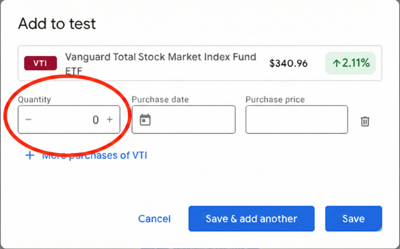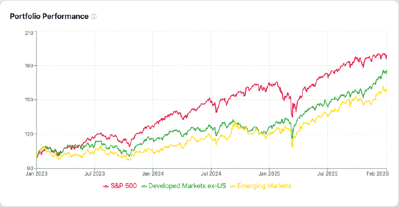 Preset Portfolios. For quick benchmarking, there are one-click presets: S&P 500 (VOO), NASDAQ 100 (QQQ), Developed Markets ex-US (VEA), Emerging Markets (VWO), Gold (GLD), Bitcoin (IBIT), and Volatility (VIXY). These make it easy to compare your custom portfolio against common benchmarks.