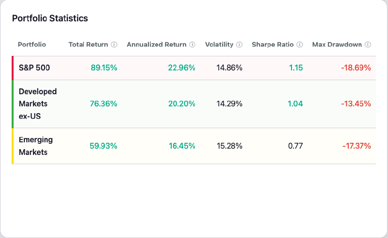 Statistics Table. A side-by-side comparison of Total Return, Annualized Return, Volatility, Sharpe Ratio, and Max Drawdown. Each metric has a tooltip explaining what it measures. If you read my previous post on compounding, you’ll recognize some of these metrics — annualized return is essentially the compound growth rate I discussed there.